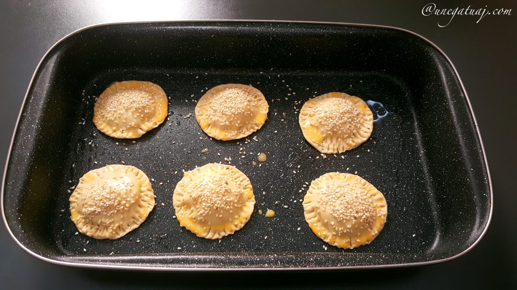 Ne secilin disk brumi vendosim nga nje luge te vogel mbushje me proshute dhe kerpudha, nje cope djathe qe shkrin (Gouda, Ementaler etj) dhe i mbyllim me kujdes duke i vendosur nje tjeter siper. I mbyllim mire anet e byreçkve dhe i lyejme ne siperfaqe me pak te verdhe veze te holluar me uje. I sperkasim me fara susami dhe i pjekim ne furre te parangrohur ne 200°C per 15 minuta. |