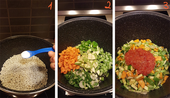Në tenxheren ku do të gatuajmë fasulet, kavërdisim në zjarr mesatar në vaj ulliri qepën e njomë, selinon, karrotën, specin jeshil dhe kungullin e njomë të prera sipas dëshirës derisa të zbuten (2). Shtojmë salcën e domateve ose domatet e kaluara në mikser dhe vazhdojmë përzierjen edhe për pak minuta (3). |