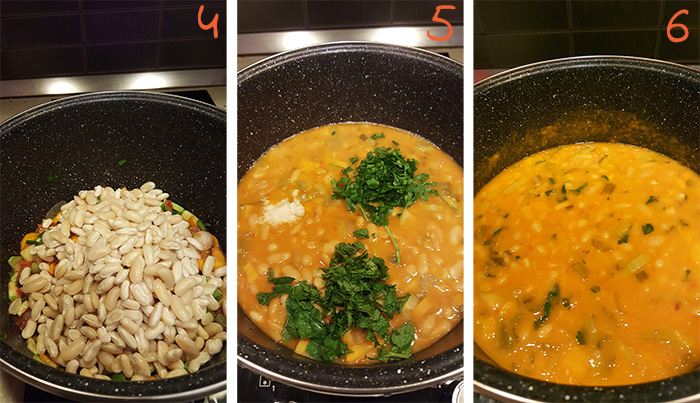 Shtojmë fasulet (4), rreth 1.5l ujë dhe i ziejmë të gjitha bashkë për 1-1.5 orë në zjarr të ulët. Unë preferoj tenxheren me presion, e cila e redukton kohën e gatimit në 30 minuta. Shtojmë pak spec të kuq të ëmbël, majdanoz, kopër, e rregullojmë me kripë (5) dhe i ziejmë akoma edhe për 10 minuta derisa e gjitha të marrë shije. Nëse shohim që ka shumë ujë, vazhdojmë zierjen derisa të arrijmë trashësinë e dëshiruar. E shërbejmë të spërkatur me pak vaj ulliri në sipërfaqe. |