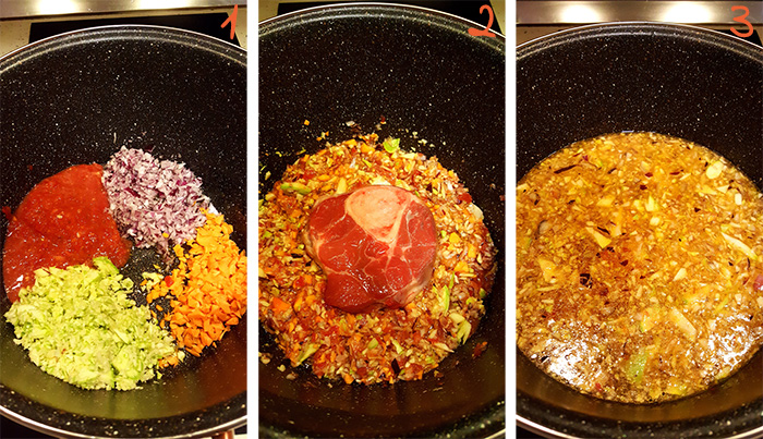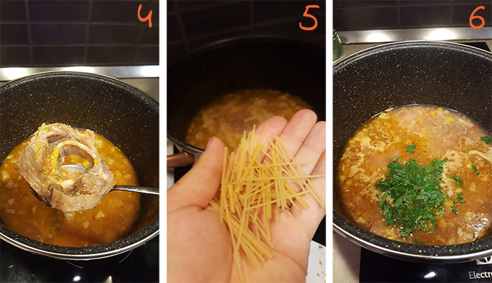 Me ndihmen e nje luge te vogel, nxjerrim palcen nga kocka dhe e hedhim brenda ne supe, nderkohe qe mishin e ndajme ne copa te vogla dhe ja shtojme supes (4). Vazhdojme gatimin edhe per rreth 10 minuta te tjera. Shtojme makaronat per supe te cilat i leme te zbuten plotesisht (5). I japim shije supes me majdanoz te fresket te grire holle (6). |